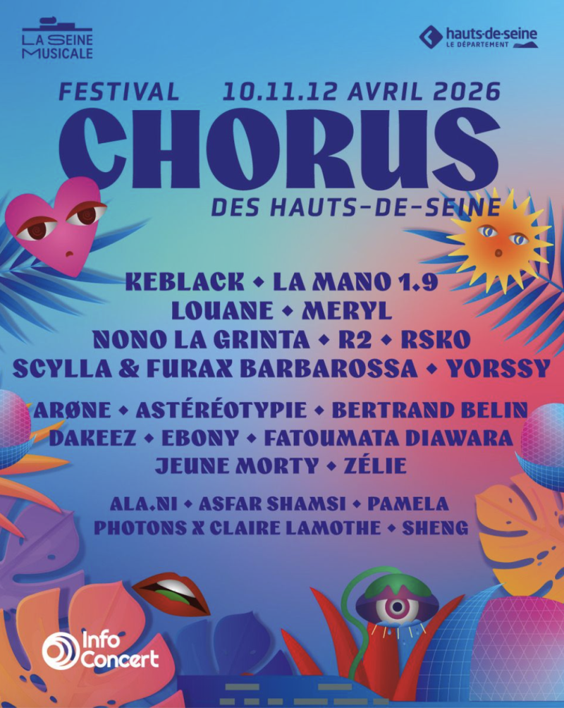 Le Festival Chorus – 38ᵉ édition se tiendra du 10 au 12 avril 2026 à La Seine Musicale (Île Seguin, Boulogne-Billancourt). Rendez-vous incontournable des musiques actuelles, il réunit plus de 60 artistes sur quatre scènes emblématiques : Grande Seine, Auditorium, RiFFX et Parvis. Durant trois jours, le festival propose un panorama riche et éclectique de la pop, du rock, du hip-hop, de l’électro, des musiques du monde et de projets singuliers, mêlant têtes d’affiche et talents émergents. L’édition 2026 s’ouvre avec le Prix Chorus, qui met en lumière cinq artistes de la scène émergente, suivi de concerts de Ala.ni, Fatoumata Diawara, Louane, Zélie, Meryl, Copilote, La Giù, Akata Kolo Orchestra, Yasmine Meddour, Bertrand Belin ou encore Keblack. Pour les familles, Chorus des enfants propose neuf spectacles immersifs adaptés aux 0-11 ans, mêlant musique, théâtre et expériences interactives, répartis sur trois espaces pour éveiller la curiosité et partager la musique avec les plus jeunes. Trois jours de concerts et d’expériences musicales où la scène devient une mosaïque de sons, de talents et d’émotions dans l’écrin acoustique unique de La Seine Musicale.