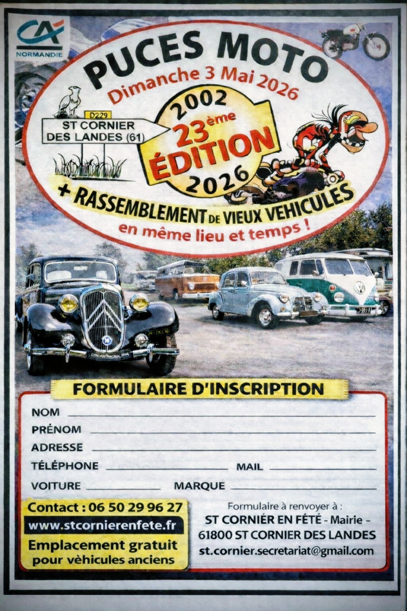 Puces moto et rassemblement de vieilles voitures et motos .fiche d'inscription a compléter et a nous renvoyer par mail merci.venez nombreux 😊😉 Restauration et boissons sur place